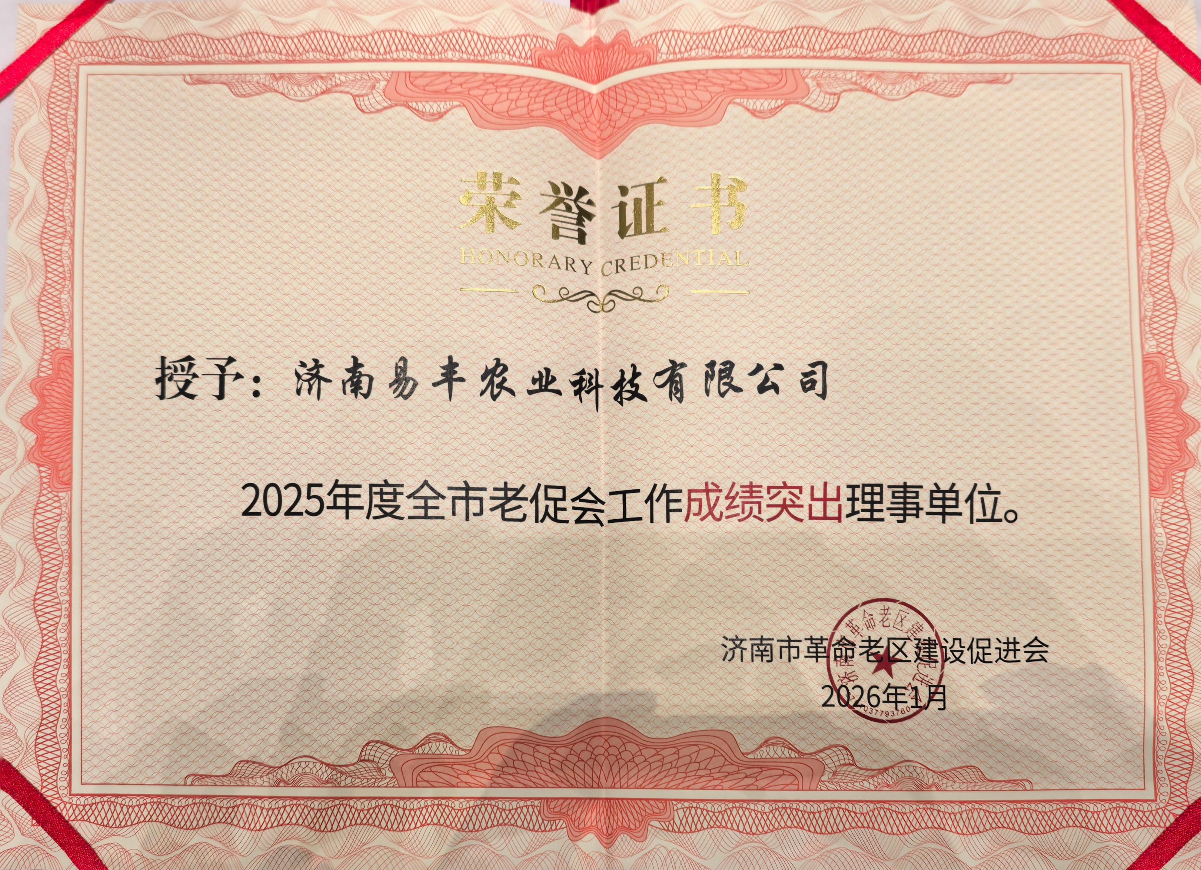 會(huì)議全面總結(jié)2025年度全市老區(qū)建設(shè)工作成效,部署2026年重點(diǎn)任務(wù),并對(duì)實(shí)績(jī)突出的先進(jìn)單位和個(gè)人進(jìn)行了表彰。易豐農(nóng)業(yè)憑借在革命老區(qū)公益幫扶與社會(huì)責(zé)任實(shí)踐中的優(yōu)異表現(xiàn),榮獲“2025年度全市老促會(huì)工作成績(jī)突出理事單位”稱號(hào)。