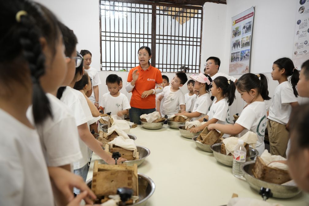 隨后,研學(xué)老師將豆花一一分至孩子們手中,放入木質(zhì)模具中用重物壓實(shí),隨著水分流出,一塊豆腐便制作完成了。在制作過(guò)程中,不僅見(jiàn)證了"黃豆"到"豆腐"的奇妙變化,還能體驗(yàn)傳統(tǒng)手藝的魅力,領(lǐng)略中國(guó)飲食文化的博大精深。