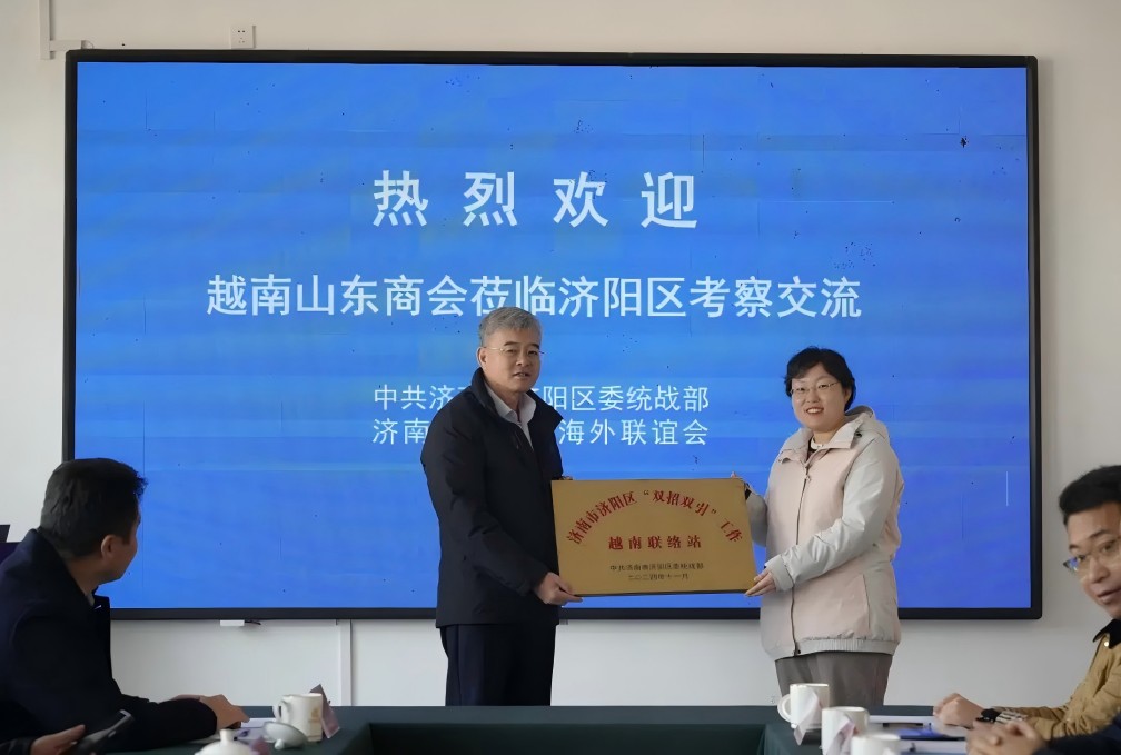 座談會上,王部長為越南中國商會山東企業(yè)聯(lián)合會頒發(fā)“濟(jì)南市濟(jì)陽區(qū)‘雙招雙引’工作越南聯(lián)絡(luò)站”站牌。