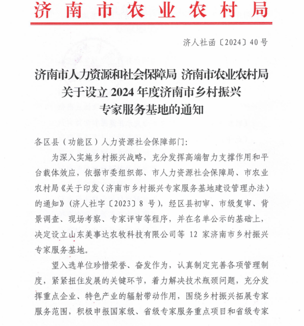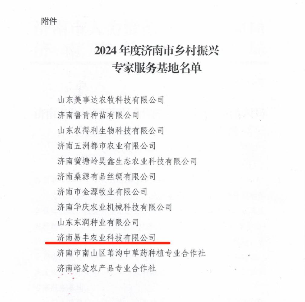 12月31日,中共濟南市委組織部、濟南市人力資源和社會保障局、濟南市農(nóng)業(yè)農(nóng)村局下發(fā)《關(guān)于設(shè)立2024 年度濟南市鄉(xiāng)村振興專家服務(wù)基地的通知》,經(jīng)過嚴格評審與層層篩選,濟南易豐農(nóng)業(yè)科技有限公司成功入選“2024年市級專家服務(wù)基地”,為專家服務(wù)鄉(xiāng)村振興提供平臺!