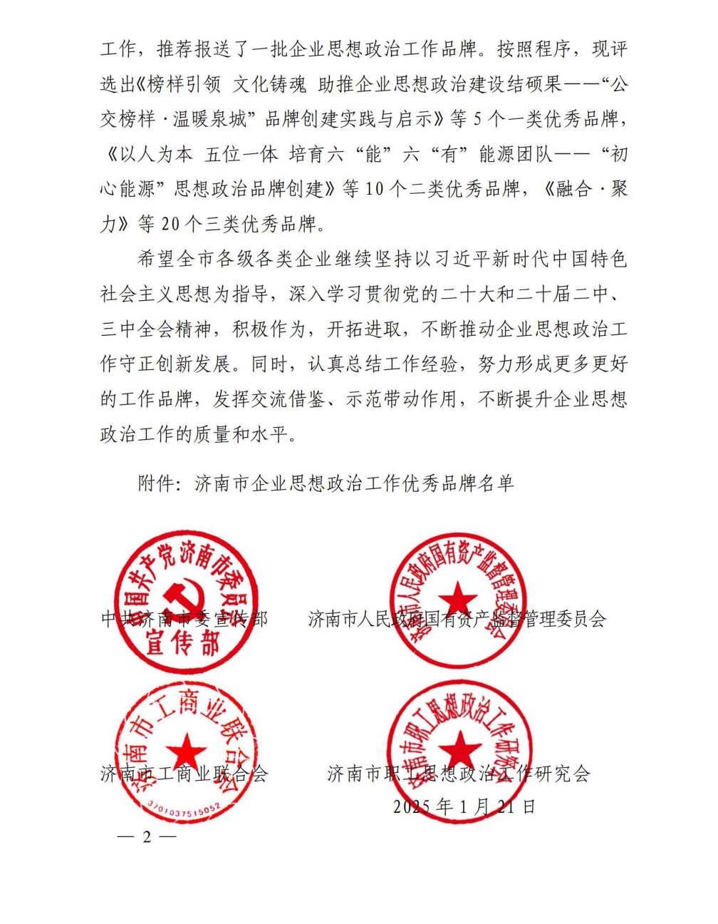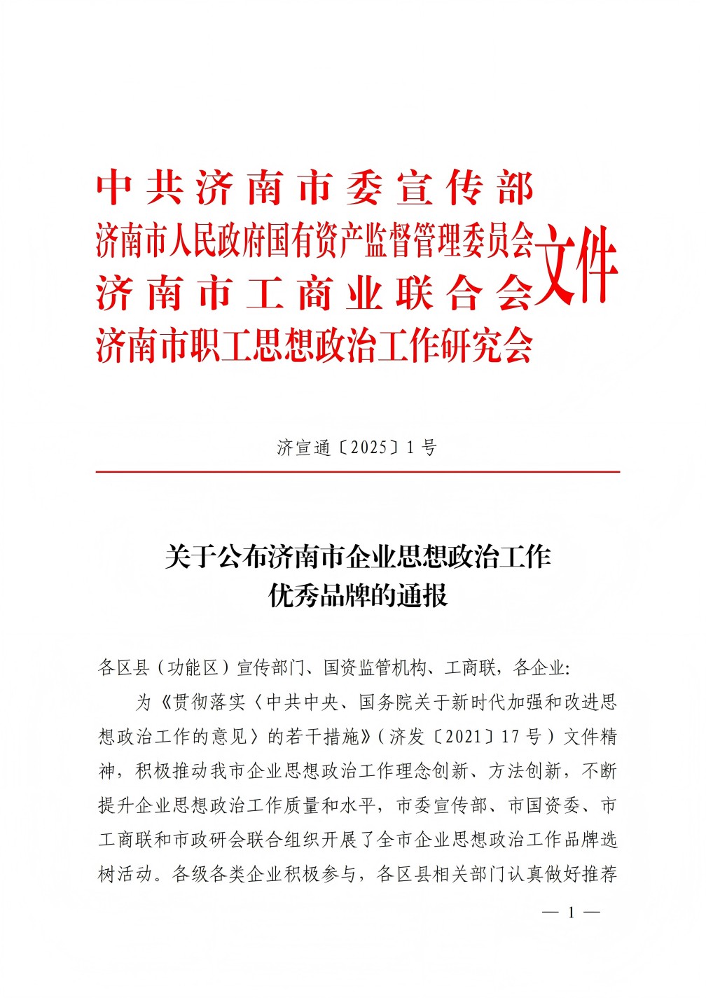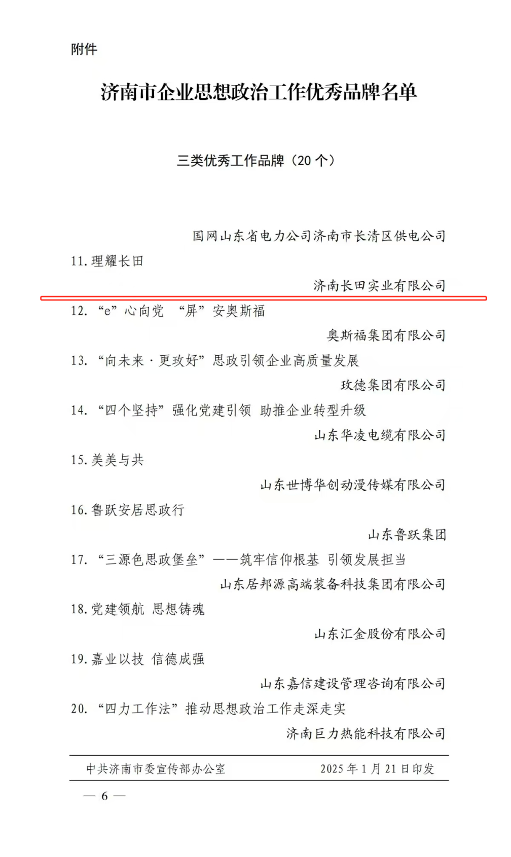 近期,市委宣傳部、市國(guó)資委、市工商聯(lián)和市政研會(huì)聯(lián)合組織開(kāi)展了全市企業(yè)思想政治工作品牌選樹(shù)活動(dòng),濟(jì)南長(zhǎng)田實(shí)業(yè)有限公司創(chuàng)建的思想政治工作品牌——“理耀長(zhǎng)田”榮獲濟(jì)南市企業(yè)思想政治工作優(yōu)秀品牌。