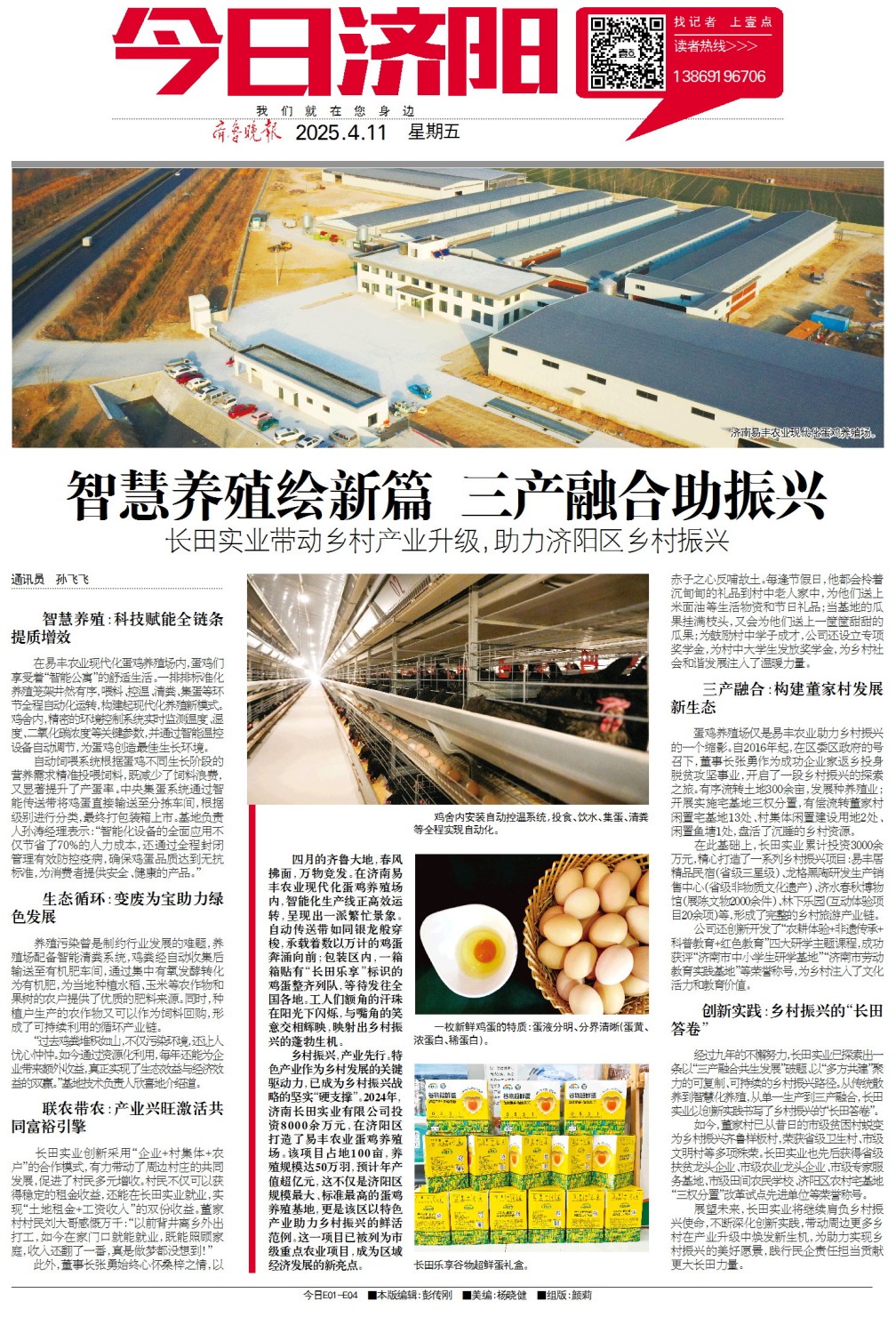 2024年,四月的齊魯大地,春風拂面,萬物競發(fā)。在濟南易豐農(nóng)業(yè)現(xiàn)代化蛋雞養(yǎng)殖場內(nèi),智能化生產(chǎn)線正高效運轉,呈現(xiàn)出一派繁忙景象。自動傳送帶如同銀龍般穿梭,承載著數(shù)以萬計的雞蛋奔涌向前;包裝區(qū)內(nèi),一箱箱貼有“長田樂享”標識的雞蛋整齊列隊,等待發(fā)往全國各地。工人們額角的汗珠在陽光下閃爍,與嘴角的笑意交相輝映,映射出鄉(xiāng)村振興的蓬勃生機。