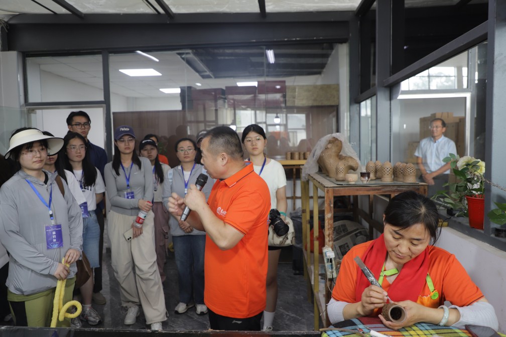 龍格黑陶藝術(shù)研究院內(nèi),傳統(tǒng)工藝與現(xiàn)代創(chuàng)新的完美融合。省級(jí)非物質(zhì)文化遺產(chǎn)項(xiàng)目代表性傳承人徐慶增老師帶領(lǐng)師生們參觀黑陶生產(chǎn)車間,他特別提到,濟(jì)陽黑陶以黃河泥為原料,經(jīng)選土、拉坯、雕刻、燒制等20余道工序制成,其“黑如漆、亮如鏡”的獨(dú)特質(zhì)感源于高溫窯變的自然反應(yīng)。現(xiàn)場演示了拉坯、雕刻技藝,手中的陶土仿佛被賦予了生命,在指尖的舞動(dòng)下逐漸成型。師生們?cè)趯I(yè)藝人的指導(dǎo)下,從揉泥、拉坯到成型,親自體驗(yàn)了黑陶的制作,最終創(chuàng)作出了屬于自己的黑陶作品。
